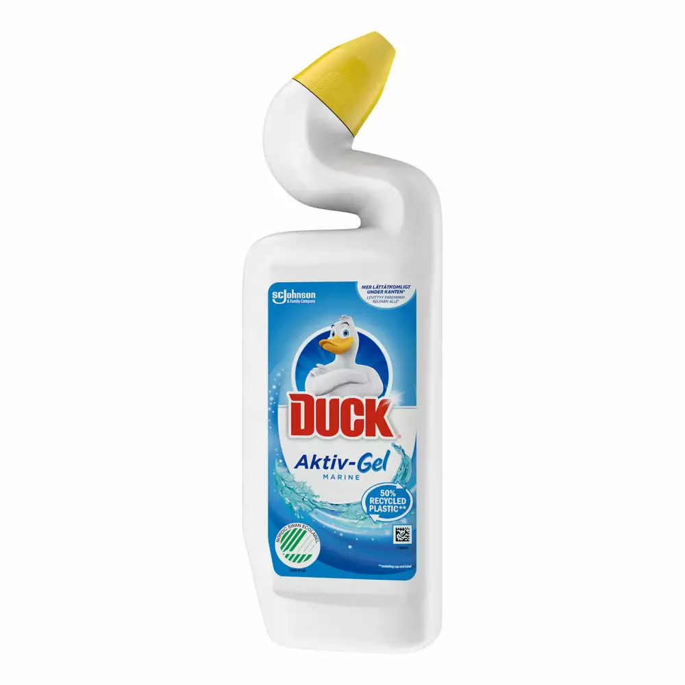 Duck Aktiv-Gel WC-puhdistusaine puhdistaa WC-istuimen tehokkaasti ja auttaa poistamaan kalkkijäämiä. Raikas Marine-tuoksu jättää WC-tilaan puhtaan ja miellyttävän tuoksun. Erityisesti muotoillun pullonkaulan ansiosta puhdistusaine leviää helposti myös vaikeasti saavutettaviin kohtiin, kuten WC-istuimen reunan alle.