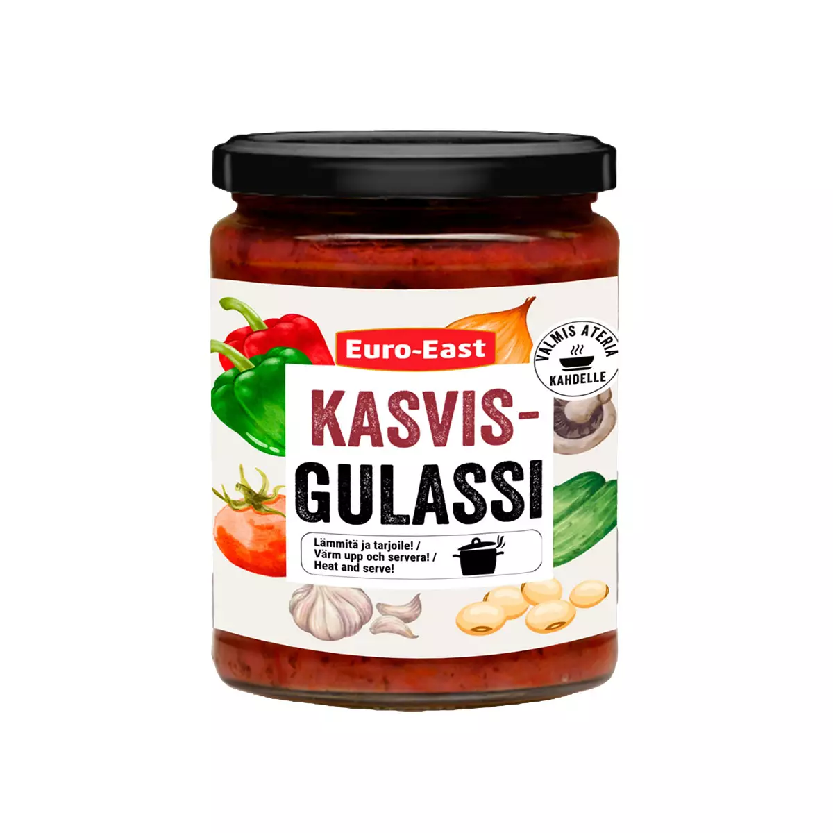 Euro-East Kasvis-Gulassi on perinteisestä unkarilaisesta padasta inspiroitu vegaaninen valmisruoka. Se sisältää sieniä, paprikaa, kurkkua, sipulia ja soijaproteiinia, jotka tuovat annokseen rakennetta ja makua. Tomaattipyreellä ja soijakastikkeella maustettu gulassi sopii tarjottavaksi sellaisenaan tai lisukkeiden, kuten riisin tai perunoiden kanssa. Täyteläinen kasvispata toimii arjen helppona ateriana.