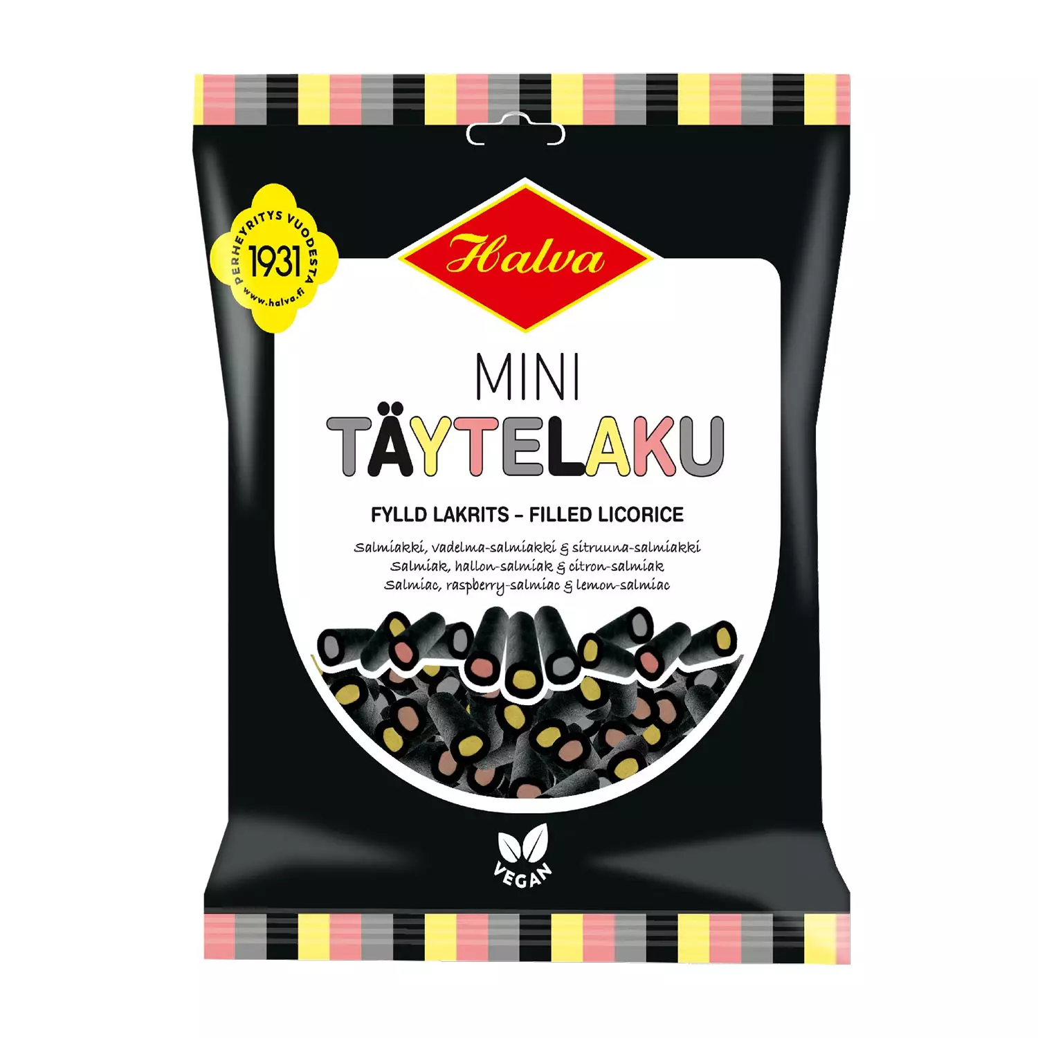 Halva Mini Täytelaku on herkullinen sekoitus salmiakin ja makean täytteen täydellistä yhdistelmää. Pussista löytyy kolmea suosittua makua: salmiakki, vadelma-salmiakki ja sitruuna-salmiakki. Pehmeä lakritsikuori kätkee sisäänsä raikkaan täytteen, joka tekee jokaisesta suupalasta vastustamattoman. Vegaaninen tuote sopii kaikille lakritsin ystäville.