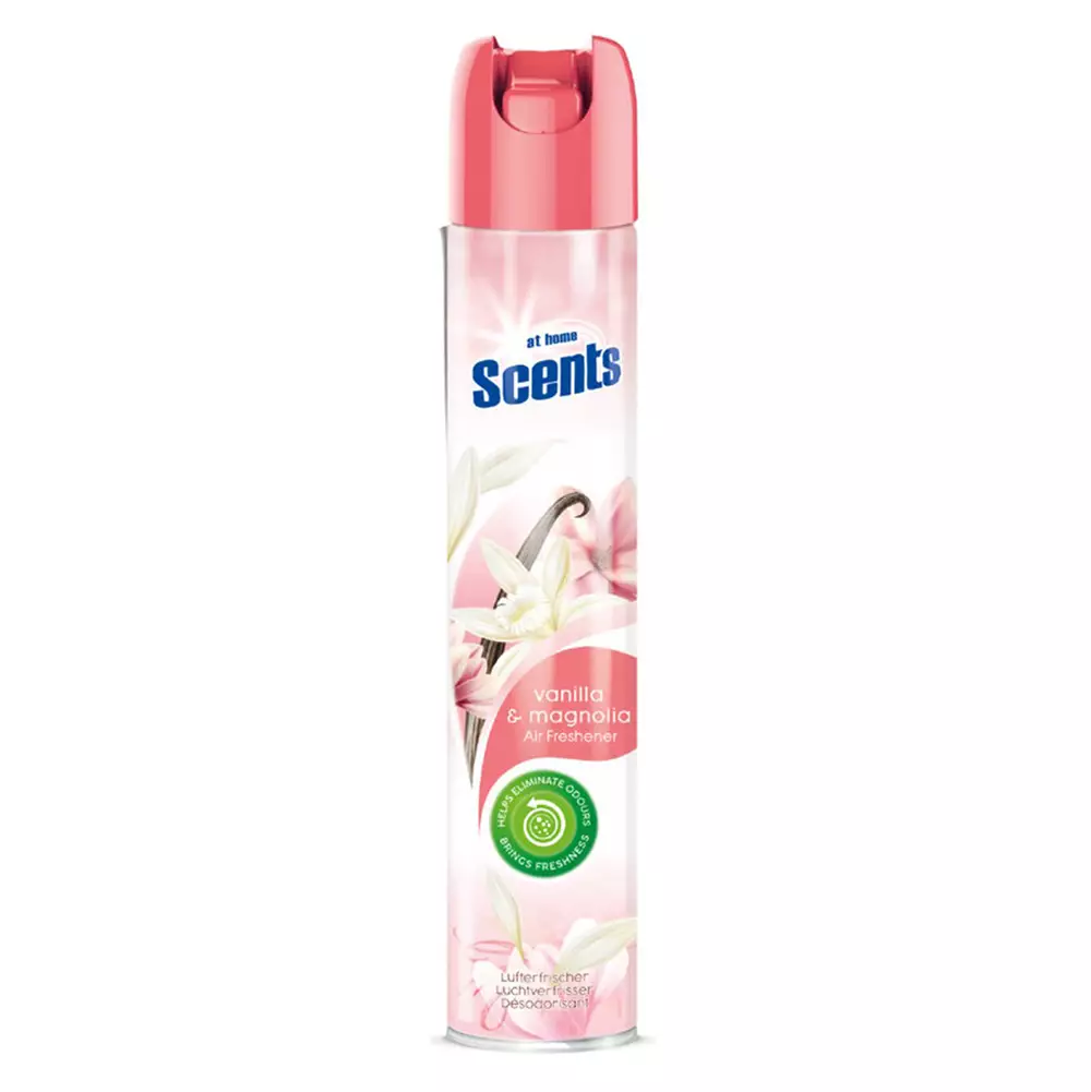 At Home Scents -ilmanraikastinsuihke tuo kotiin pehmeän ja miellyttävän tuoksun, jossa makea vanilja ja kukkainen magnolia muodostavat harmonisen kokonaisuuden. Tuoksu raikastaa ilman nopeasti ja auttaa poistamaan epämiellyttäviä hajuja.