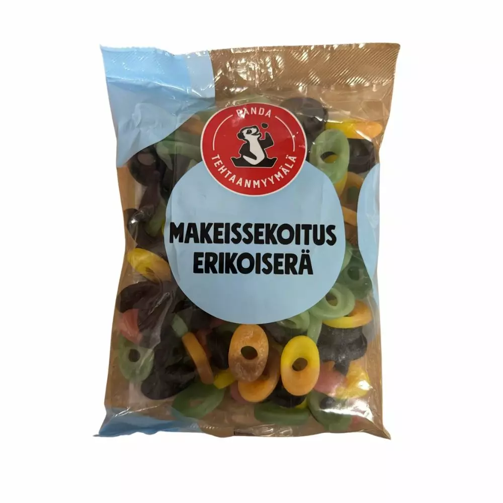 Panda Tehtaanmyymälän makeissekoitus on herkullinen yllätyspussi täynnä Pandan rakastetuimpia makuja! Jokainen pussi sisältää ainutlaatuisen sekoituksen tehtaan tuotantolinjalta pelastettuja makeisia.