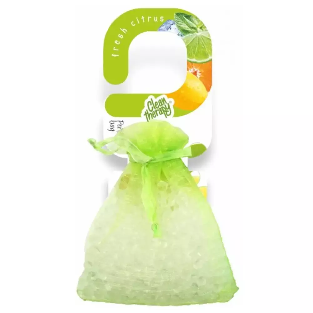 Clean Therapy Fresh Citrus -raikastinpussi tuo miellyttävän sitruksisen tuoksun kaappeihin, laatikoihin ja laukkuihin. Kätevä 20 g tuoksupussi sopii esimerkiksi vaatekaappiin, komeroon, käsilaukkuun tai reppuun pitämään tilan raikkaana. Fresh Citrus on pirteä yhdistelmä sitruunan raikkautta ja appelsiininkukan pehmeää vivahdetta. Tuoksupussi vapauttaa tuoksua tasaisesti ja auttaa ehkäisemään tunkkaisia hajuja pienissä säilytystiloissa.