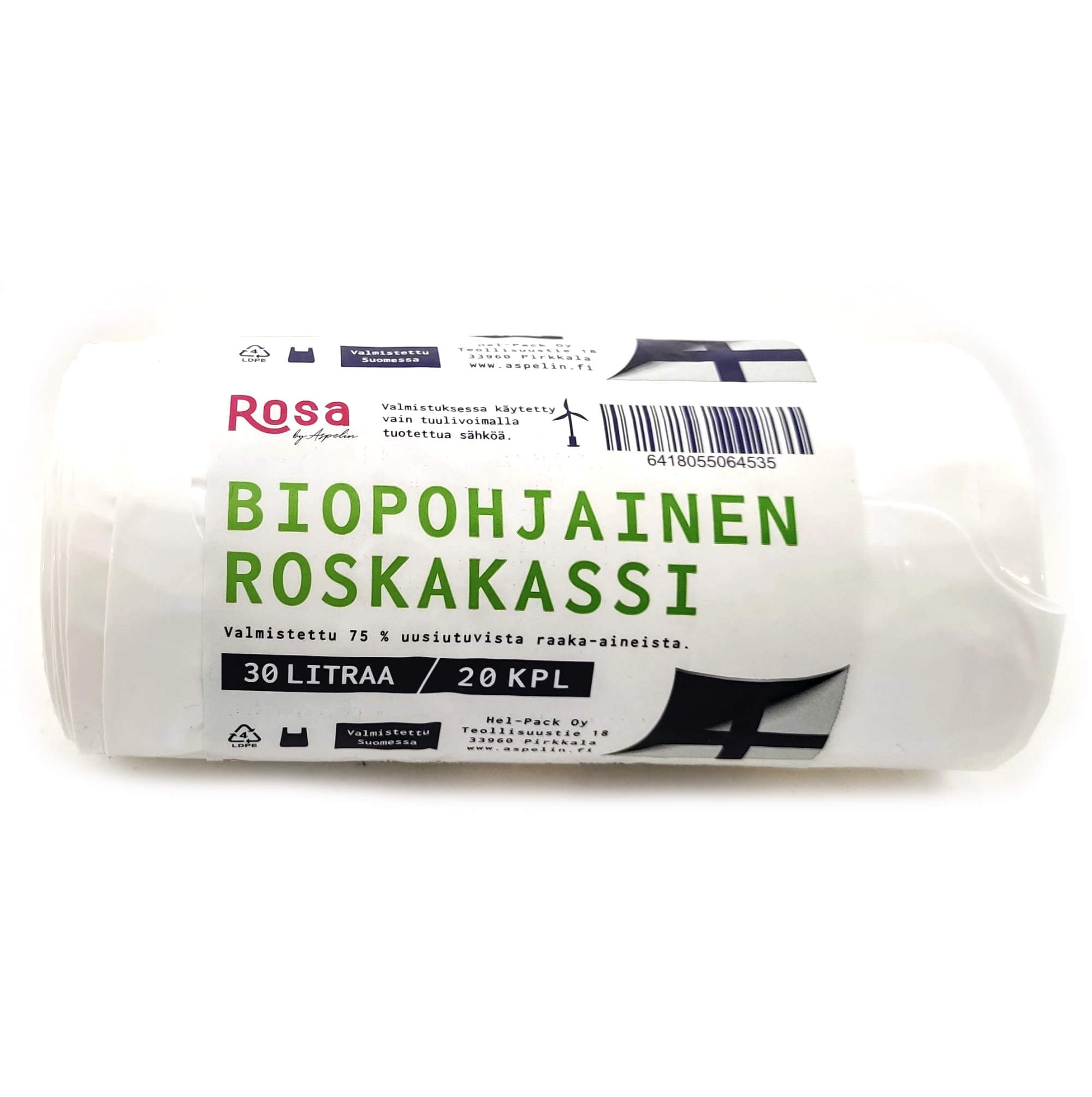 Rosa kotimainen valkoinen biopohjainen roskakassi 30 litraa. Koko 52x60 cm, vahvuus 18 my, valmistettu 75 % sokeriruo'osta ja 25 % LD-PE muovista. Rullassa 20 kpl.