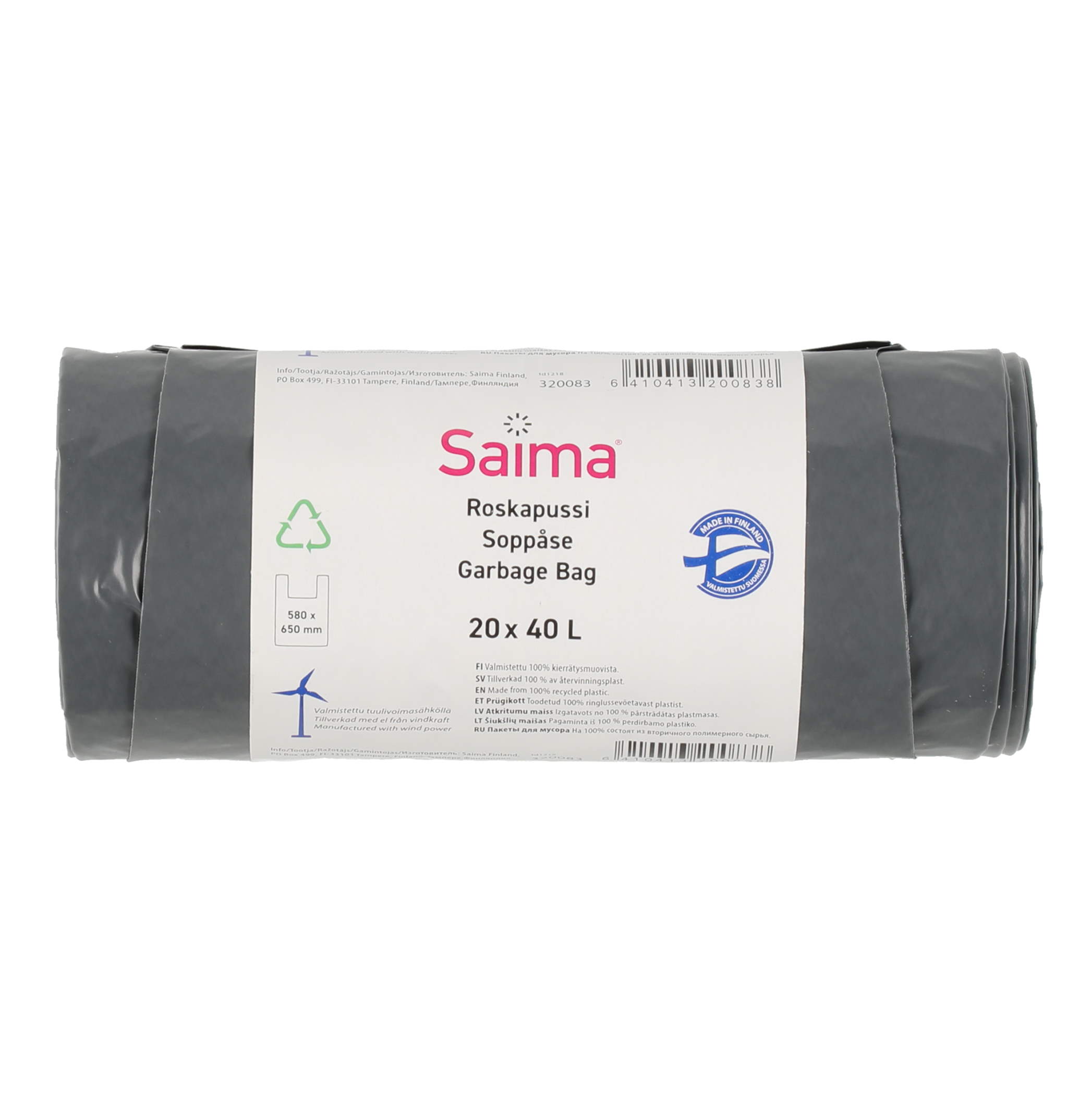 20 kpl/rulla. Sangallinen. Pussin koko: 580 x 650 mm. Vahvuus 29 mikronia. Valmistettu Suomessa. Valmistettu kierrätysmuovista tuulivoimasähköllä.