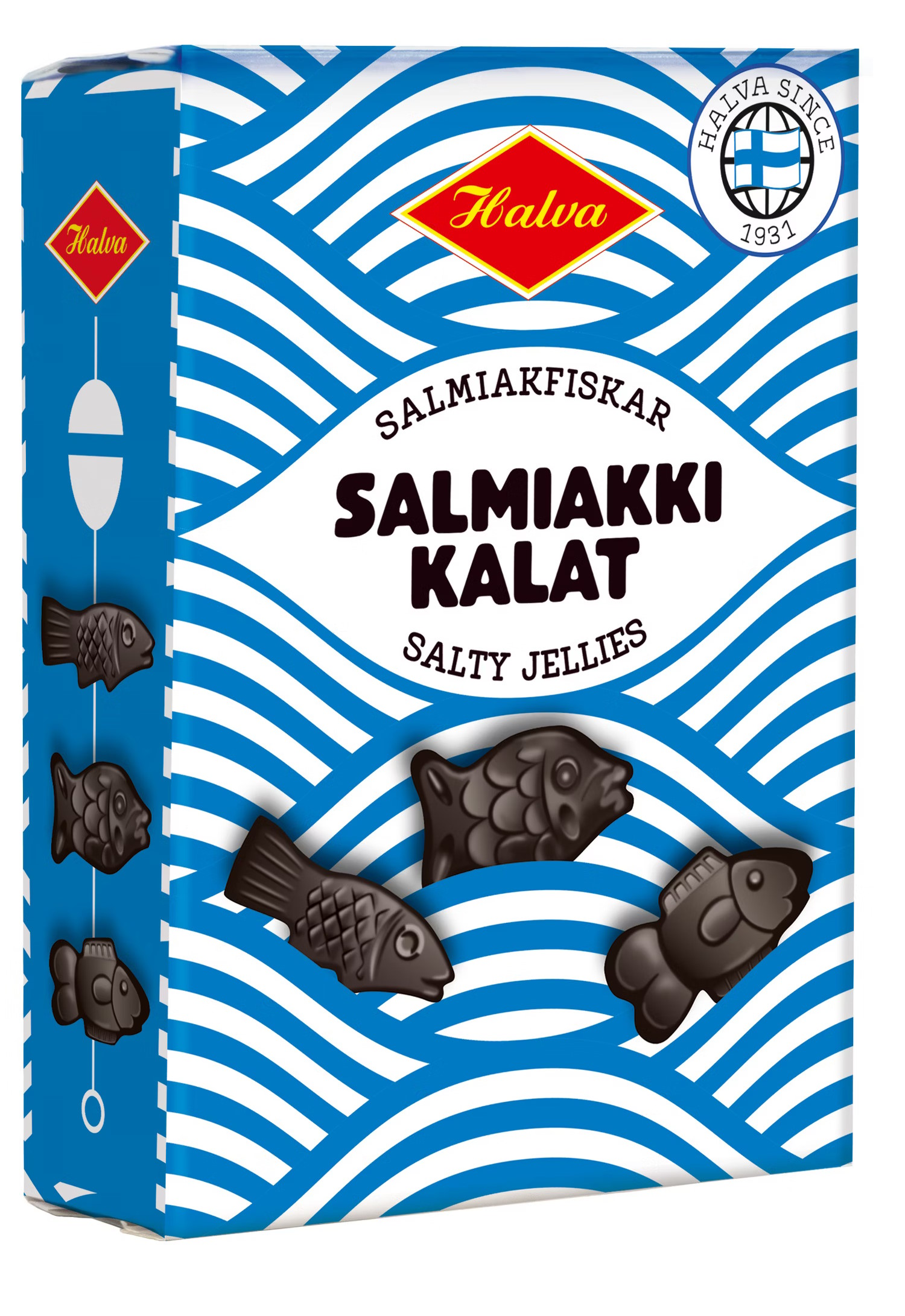 Salmiakkikalat 240g Halva on rasiallinen suolaisia kalalajeja: eväkala, pusukala ja suolasilli! Valmistettu Helsingissä.