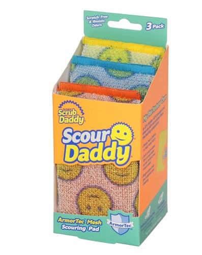 Puhdistussieni Scour Daddy vaativiin operaatioihin! ArmorTec®-verkkomateriaali on lämpökäsiteltyä, minkä ansiosta se hylkii ruokajäämiä ja puhdistaa pahastikin palaneet vuoat. Scour Daddy on 18 % vahvempi kuin kilpailevat tuotteet, ja meidän mielestämme myös 100 % söpömpi. Irrotettava ripustuslenkki tekee kuivatuksesta ja säilytyksestä helppoa. Voidaan käyttää kaikille pinnoille kristallista kromiin keittiössä, kylpyhuoneessa, puutarhassa.