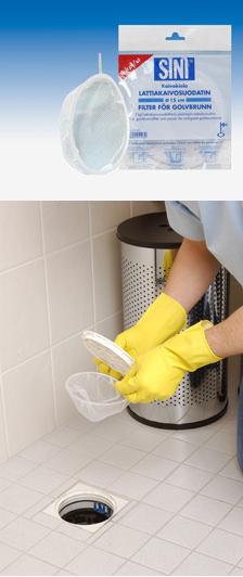 - Helposti vaihdettavan suodattimen normaali vaihtoväli on noin kuukausi. Puhdistettaessa lattiakaivoa on hyvä käyttää käsineitä.
