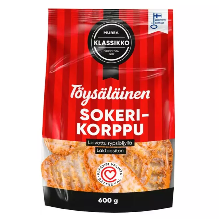 Töysäläinen Sokerikorppu on valmistettu perinteisellä ammattitaidolla. Rypsiöljyllä leivottu sokerikorppu on saanut Parempi valinta -sydänmerkin. Laktoositon, munaton. Valmistettu Suomessa