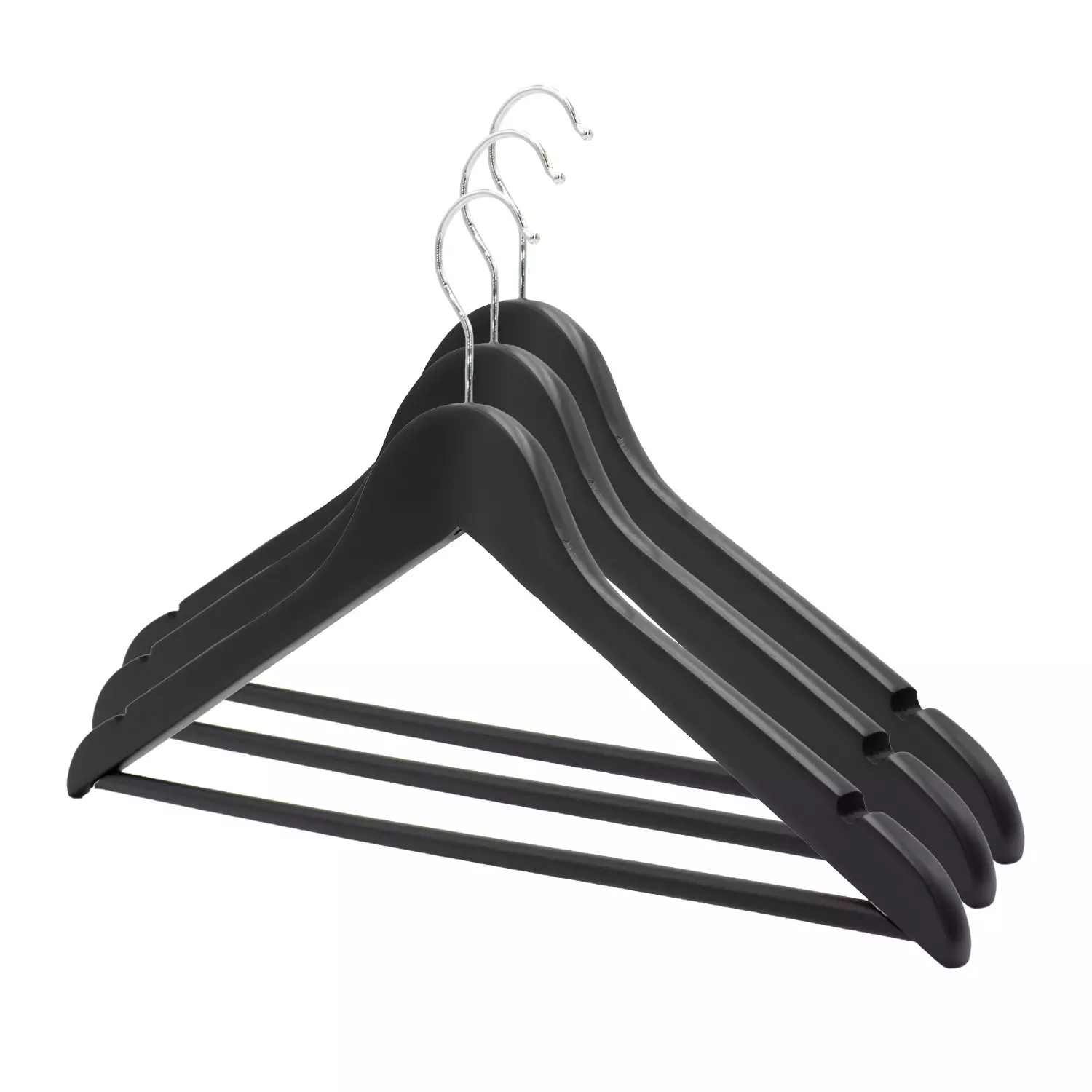 3 kappaleen pakkaus mustaksi maalattuja puisia vaateripustimia tuo kauniin ja yhtenäisen ilmeen vaatekaappiin. Henkarit on valmistettu A-laatuisesta puusta, ja niissä on tukeva välipuu, joka soveltuu erinomaisesti housujen, hameiden ja muiden vaatteiden ripustamiseen. Hopeinen teräskoukku on kestävä ja viimeistelee ripustimen tyylikkään ulkonäön. Klassinen henkarimalli sopii sekä arki- että juhlavaatteiden säilytykseen.