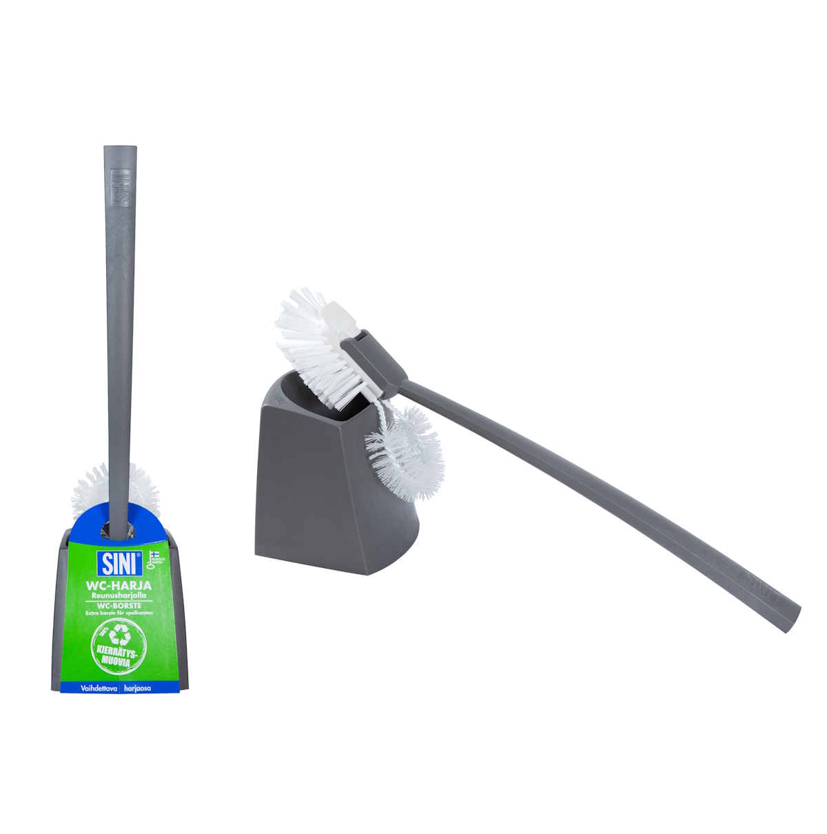 Kierrätysmuovista valmistettu wc-harja on yhtä kestävä ja laadukas kuin neitseellisestä muovista valmistettu. Wc-harjan ohella SINI-vaihtopäätiskiharja sekä SINI-teippiharja valmistetaan kierrätysmuovista.