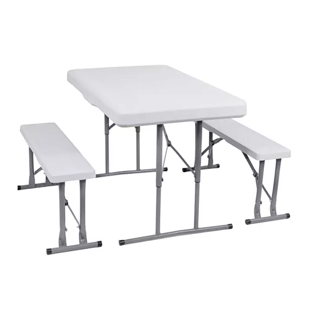 Kestävästä HDPE muovista valmistettu kokoontaitettava festarisetti. Terjäsjalat, pöydän pintamateriaalissa puujäljitelmä.