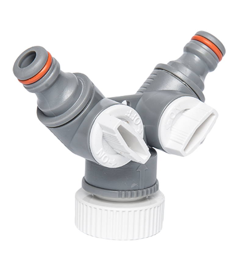Hanaliitin kahdelle kasteluletkulle. Molemmat lähdöt varustettu sulkijalla.