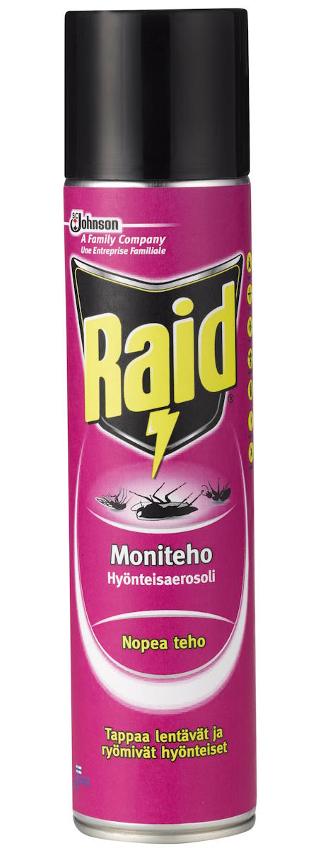 Raid Moniteho -hyönteiskarkote torjuu nimensä mukaisesti monet eri hyönteisongelmat. Tuote tehoaa nopeasti sekä ryömiviin että lentäviin hyönteisiin. Moniteho on Suomessa valmistettu tuote, jolla on Avainlippu-tunnus.