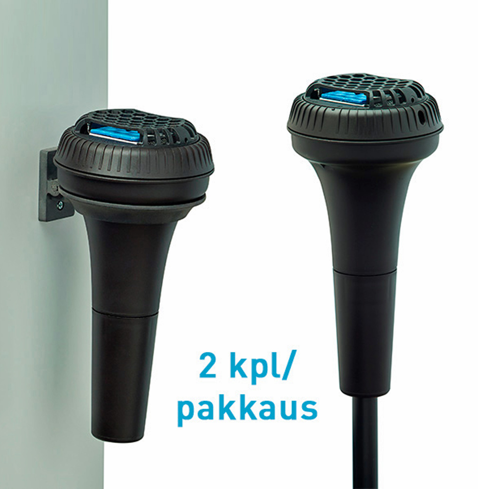 - Hyttystorjuntalaitteet voi kiinnittää telineisiin tai painaa maahan