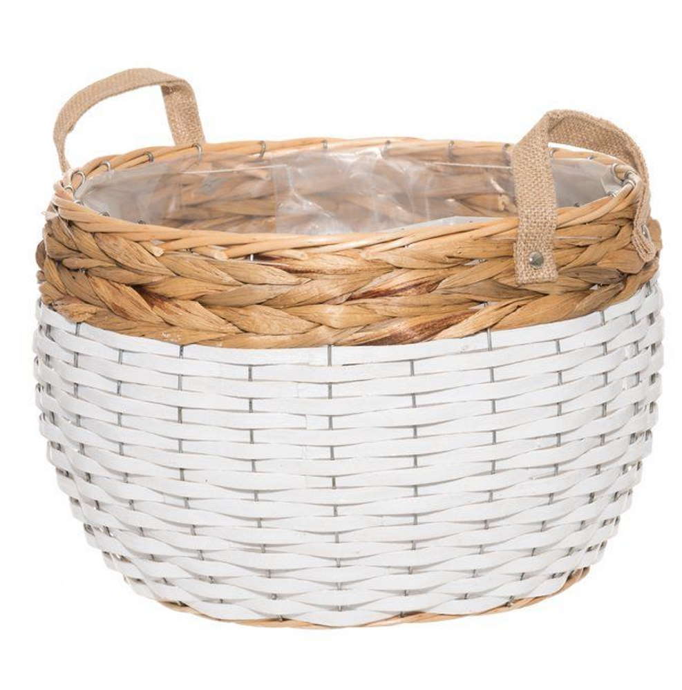 Ylöspäin kapeneva malli. Juuttikankaiset kahvat. Muovitettu.