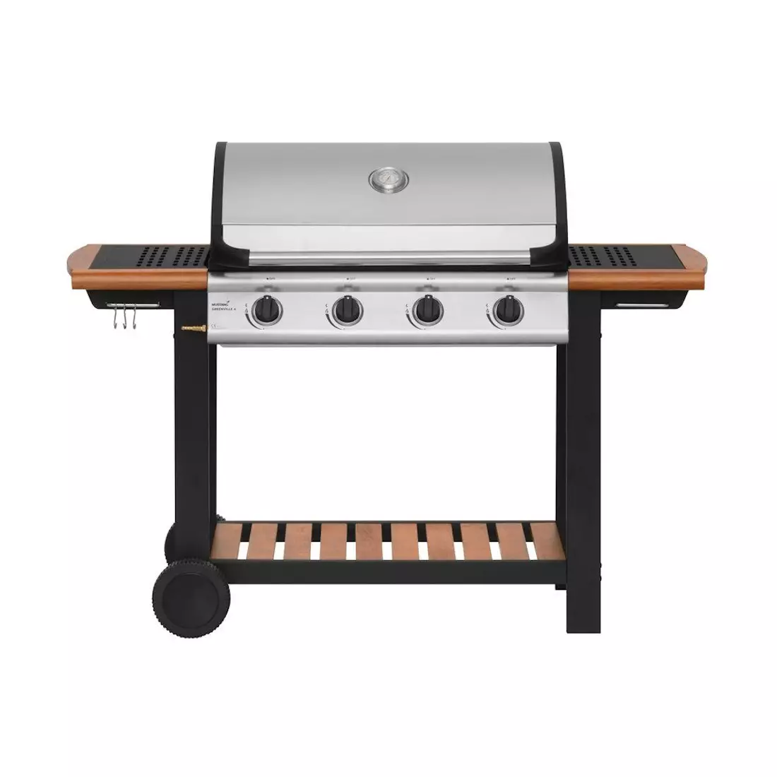 Näyttävä ja tukeva 4 valurautapolttimella varustettu kaasugrilli. Kokonaisteho 14,0 kW. Grillausala 77 x 41 cm, joka on jaettu mattaemaloidun grillausritilän 38 x 41 cm ja mattaemaloidun parilan 38 x 41 cm kesken. Lämmitysritilä kromatusta lankateräksestä 77 x 14 cm. Grillin näyttävät puuosat vastuullisesti kasvatettua puuta. Polttimien päällä aluminoidusta teräksestä valmistetut lämmönjakopellit 2 kpl. Piezo-sytytys sisäänrakennettu jokaiseen säätönuppiin. Grillin kansi ja ohjauspaneli 430 ruostumattomasta teräksestä. Grillin runko pulverimaalattua terästä. Tulilaatikon alla sinkitystä teräksestä valmistettu rasvapelti. Grillin siirtelyä helpottaa 2 isoa pyörää.