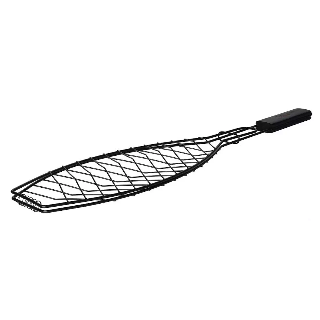 Ruostumattomasta teräksestä valmistettu kalahalstari yhdelle kalalle. Musta pinnoite. Ritilä 38 x 14 cm.