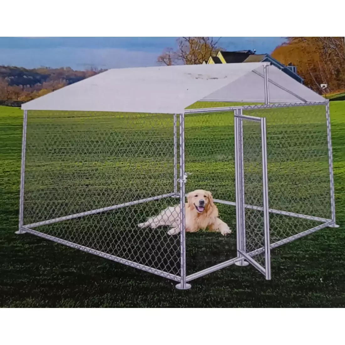 Koiratarha-/kenneli katoksella, koko 2,0x2,0x1,2m. Kuumagalvanoidut teräsputket, halk. 32x0,8mm. Kuumagalvanoitu teräsverkko, silmäkoko 50x50mm.