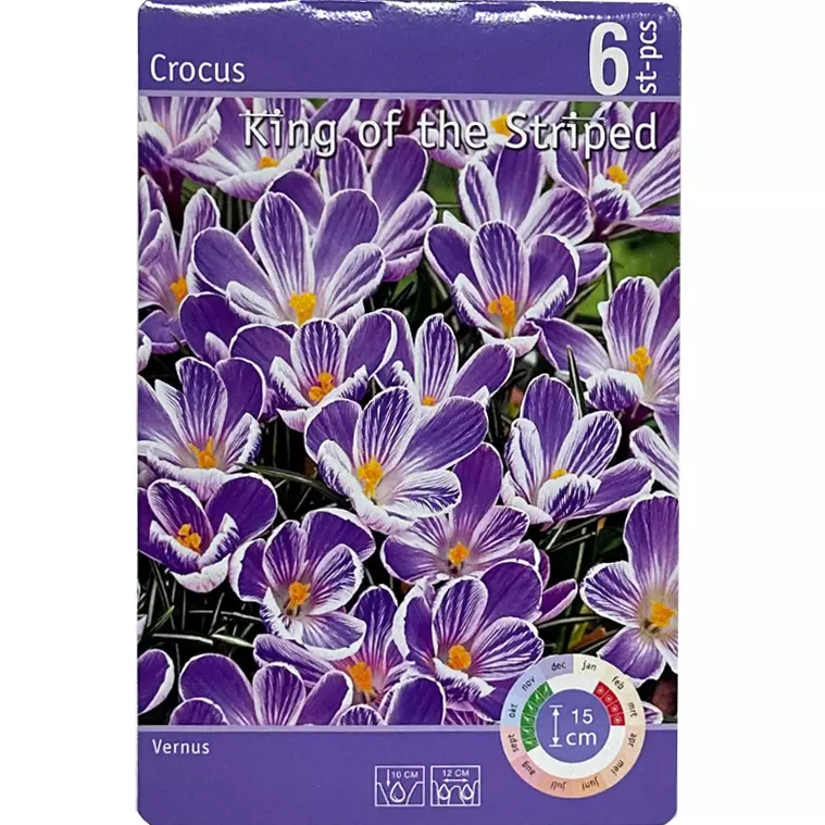 Crocus King of the Striped on näyttävä krookuslajike, jonka violetin ja valkoisen raidalliset kukat hehkuvat kevätauringossa. Kukkien keskusta kimaltelee kirkkaan keltaisena, mikä tekee niistä erityisen viehättäviä. Tämä lajike tuo pirteää väriä puutarhaan jo varhain keväällä ja sopii mainiosti niin nurmikolle, kukkapenkkeihin kuin ruukkuihinkin.