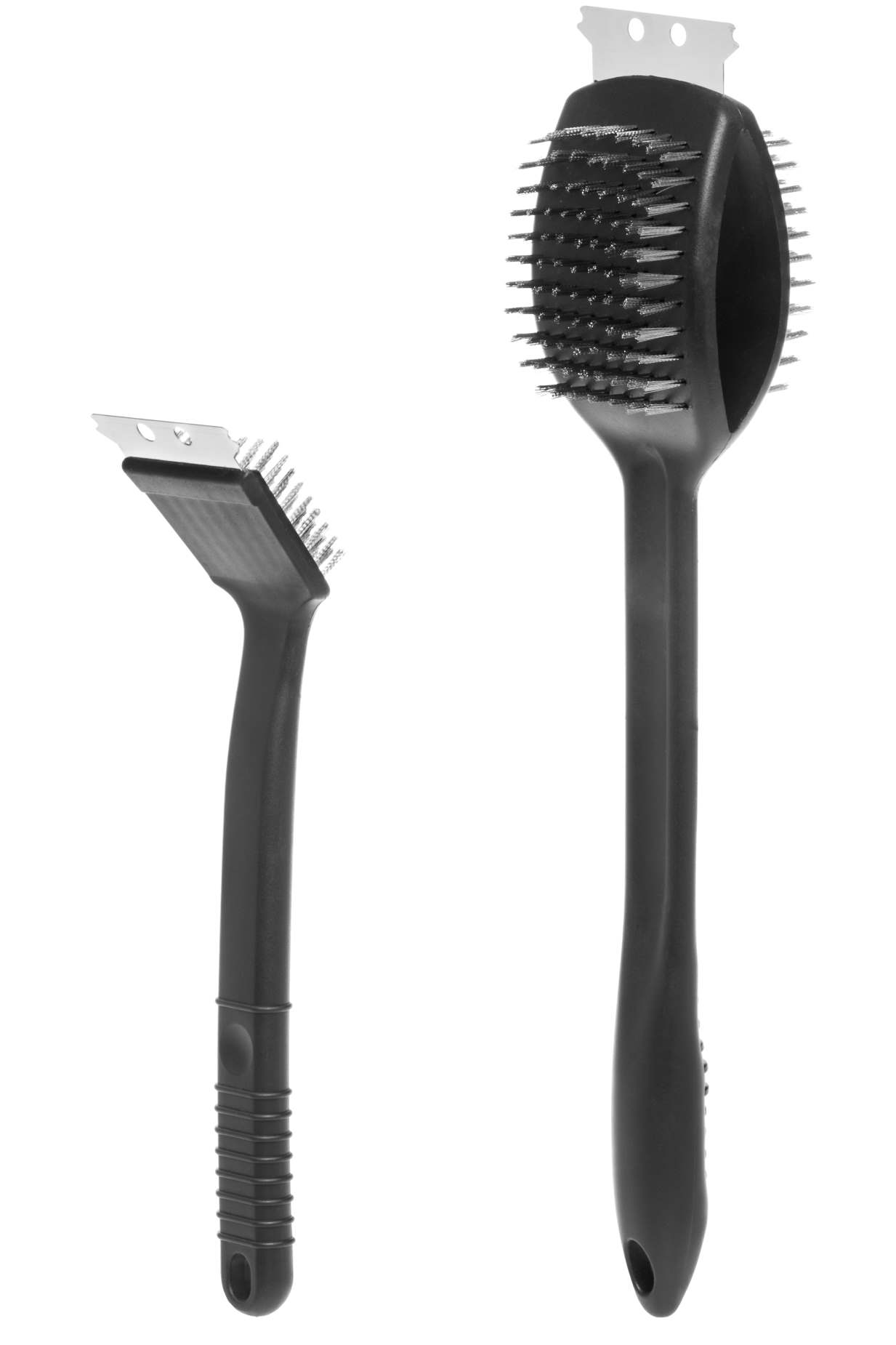 Grillin puhdistusharjasarja, jossa 2 puhdistusharjaa. Pitkä kaksipuoleinen kärkilastalla ja lyhyt yksipuoleinen kärkilastalla.