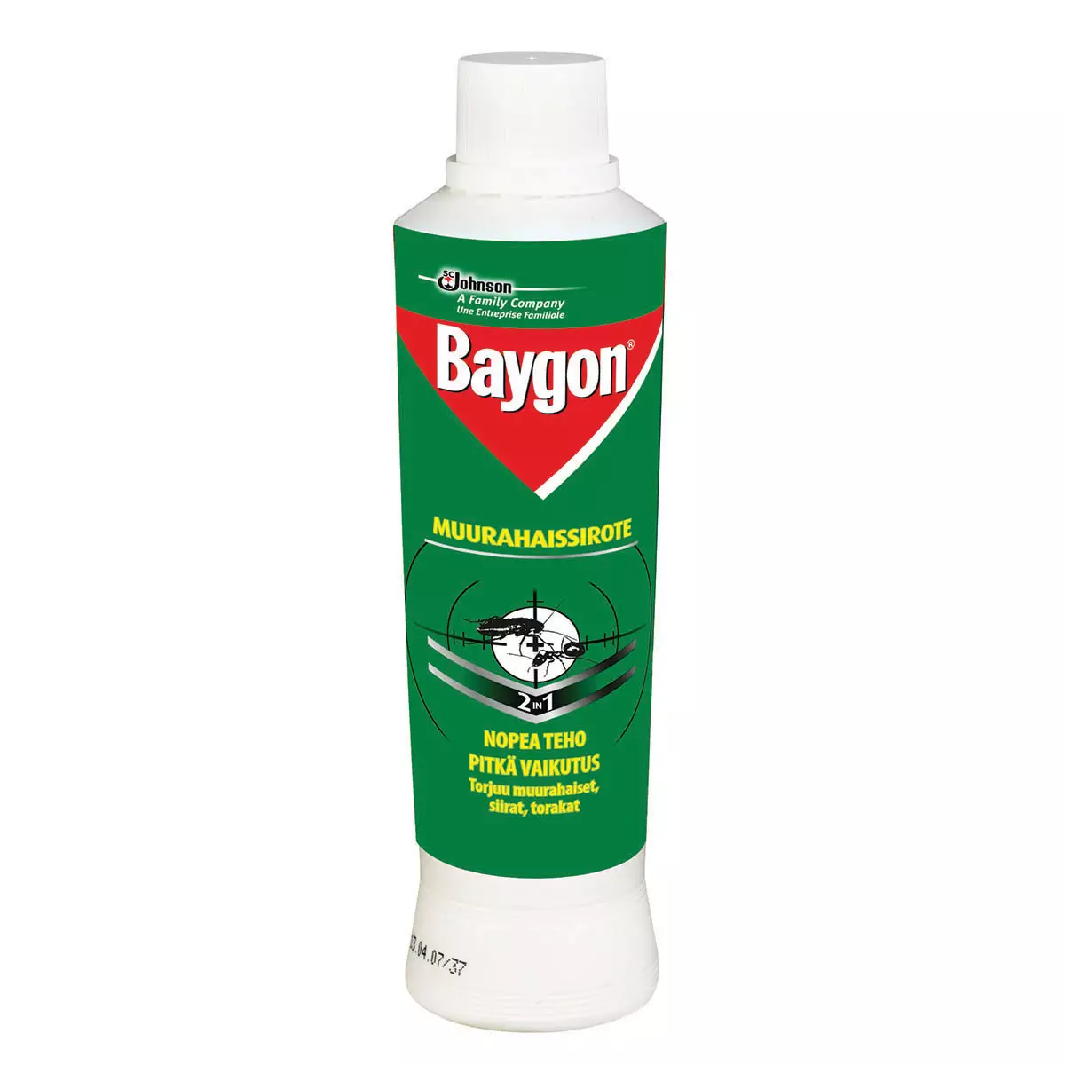 Baygon Muurahaissirote on tehokas torjuntatuote muurahaisten, siirojen ja torakoiden hävittämiseen rakennuksista ja niiden välittömästä läheisyydestä. Sirote estää muurahaisia pääsemästä sisätiloihin, kun sitä levitetään esimerkiksi rakennuksen kivijalan ympärille.