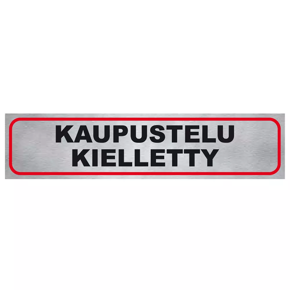 Veden- ja säänkestävä itseliimautuva infotekstitarra. Ulkonäkö metallia muistuttava, hopeanvärisellä taustalla mustat kirjaimet punaisessa kehyksessä, heijastava.