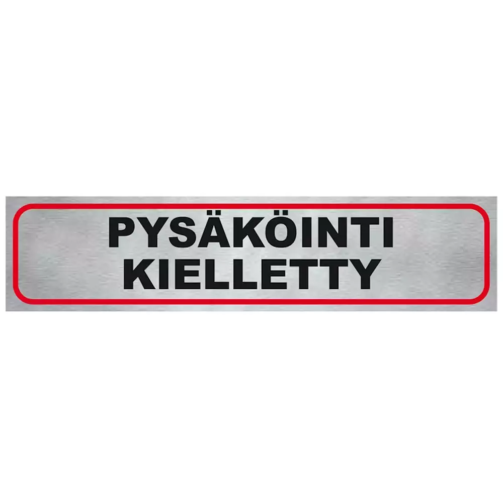 Veden- ja säänkestävä itseliimautuva infotekstitarra. Ulkonäkö metallia muistuttava, hopeanvärisellä taustalla mustat kirjaimet punaisessa kehyksessä, heijastava.