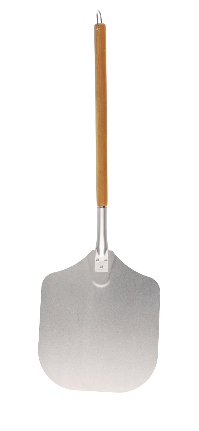 Pitkällä puukahvalla varustettu pizzalapio. Kahva akaasia-puuta. Lapio-osan koko 30,5 x 30 cm.