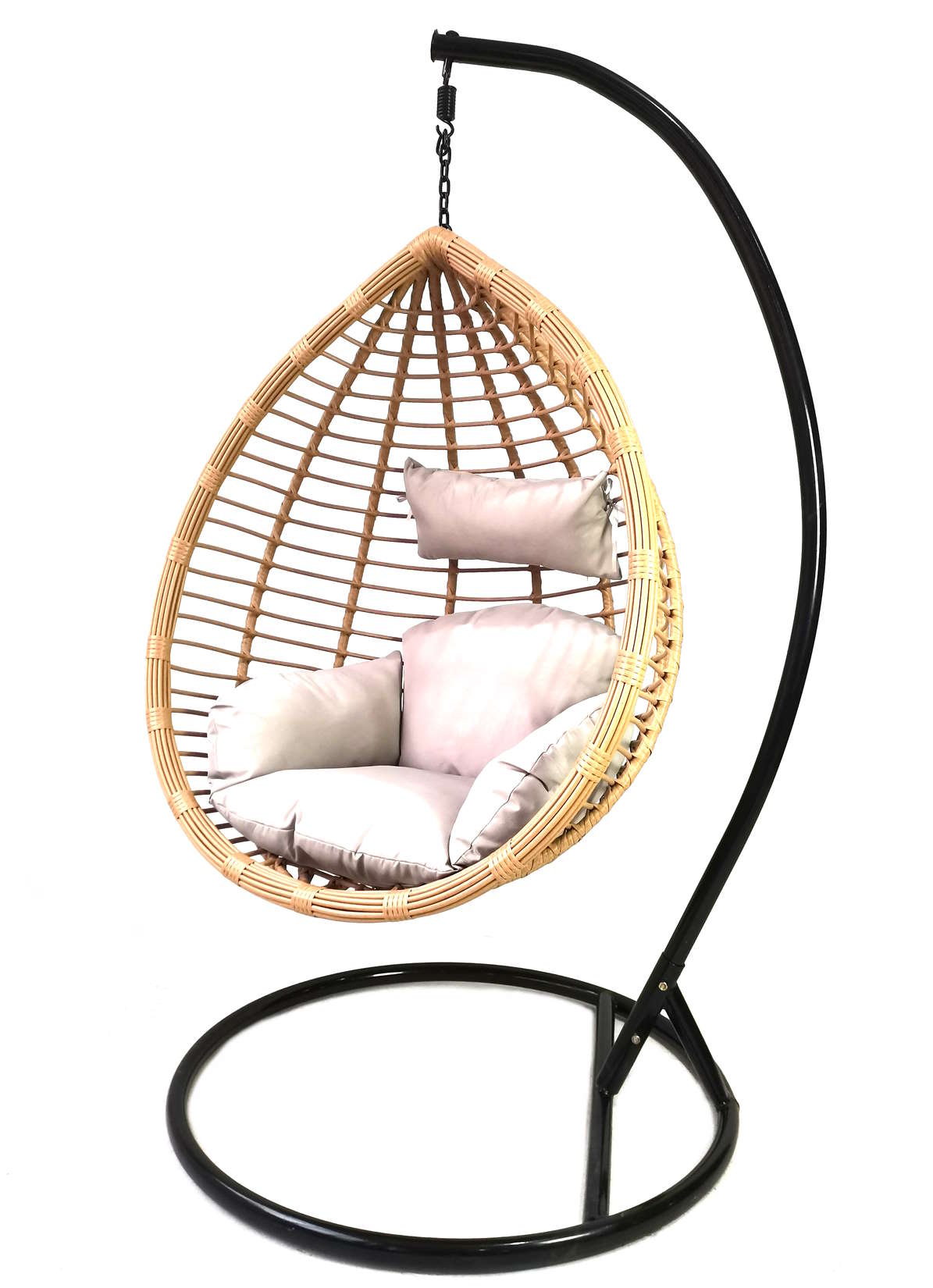 Polyrottinki punoksesta valmistettu riipputuoli teräksisellä jalkaosalla. Mukaan kuuluu suuri istuintyyny narukiinnityksellä. Rottinkiväri. Maksimikantavuus 120kg. Koko105x120x70cm. Teline 195x105cm.