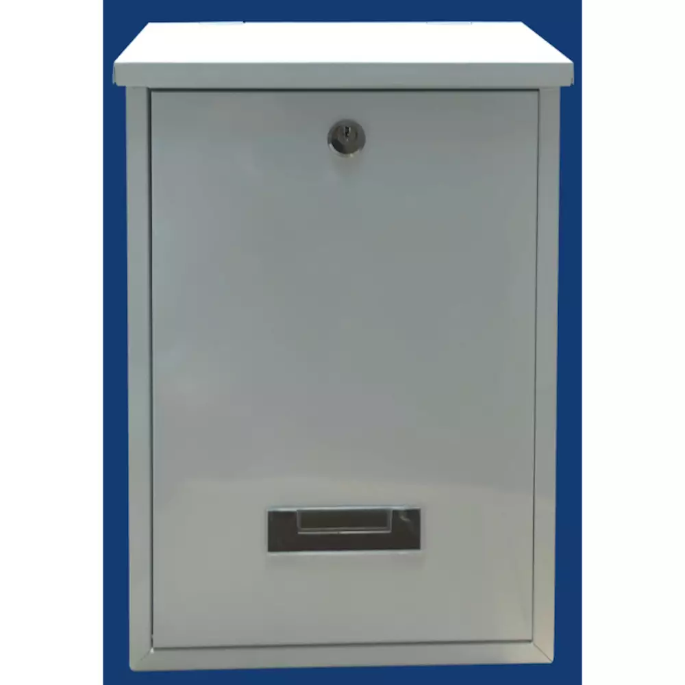 Lukolla ja kahdella avaimella varustettu galvanisoidusta teräksesta valmistettu kestävä postilaatikko.