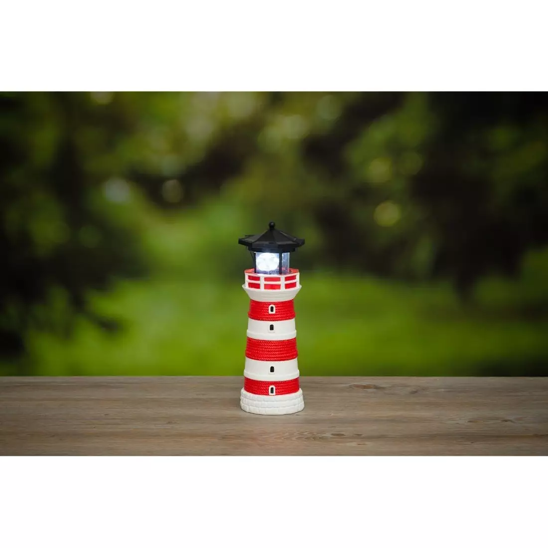 Merellinen majakkapatsas pyörivällä majakanvalolla. 1 kpl kylmä valkoinen LED 0.06W, 2lm. Akun tyyppi 1.2V AAA 200mAh Ni-Mh ladattava akku. Aurinkopaneelin tyyppi, jännite ja virta: amorfinen silikoni, 2V, 20mA. Toiminta-aika täyteen ladattuna: 6 tuntia IP-luokka: IP44.