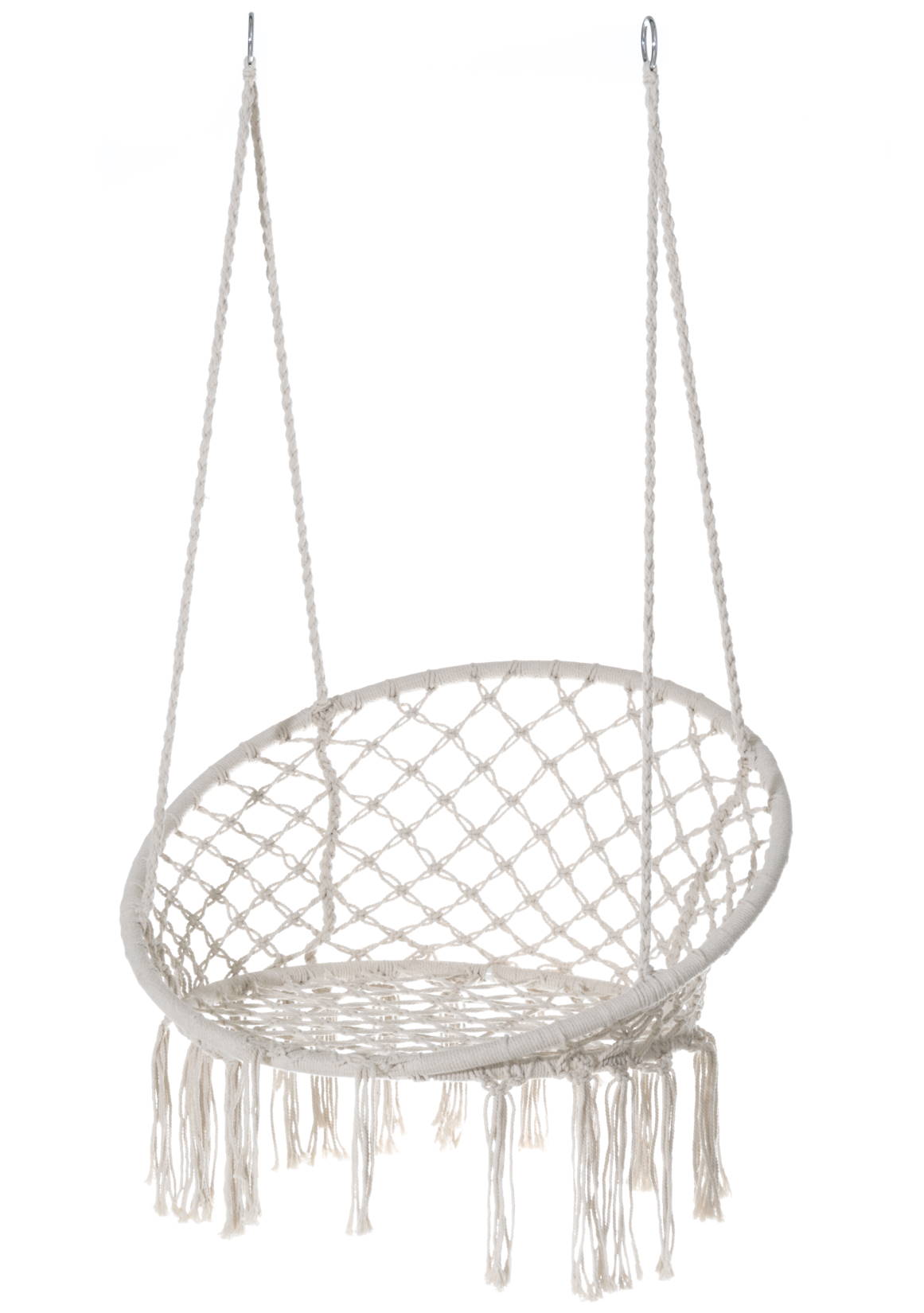 Kaunis makramee-henkinen riipputuoli. Enimmäiskantavuus 120 kg. Kiinnikkeet eivät kuulu pakkaukseen.