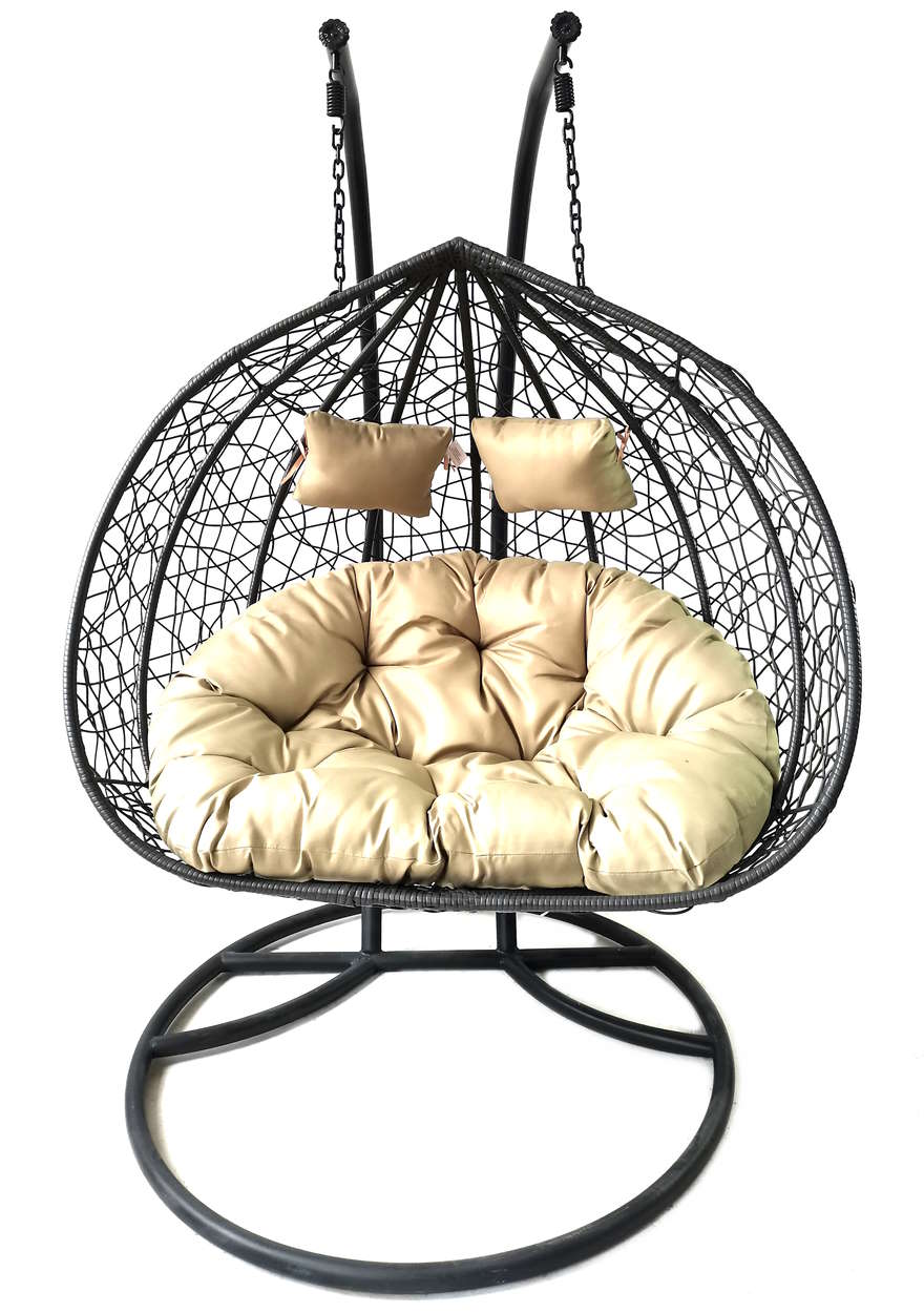 Kahden hengen malli tukevalla tuplatelineellä. Istuinosa leveys 132cm. PE-rottinkipunoksesta valmistettu riipputuoli teräksisellä jalkaosalla. Mukaan kuuluu suuri istuintyyny narukiinnityksellä. Maksimikantavuus 180kg.