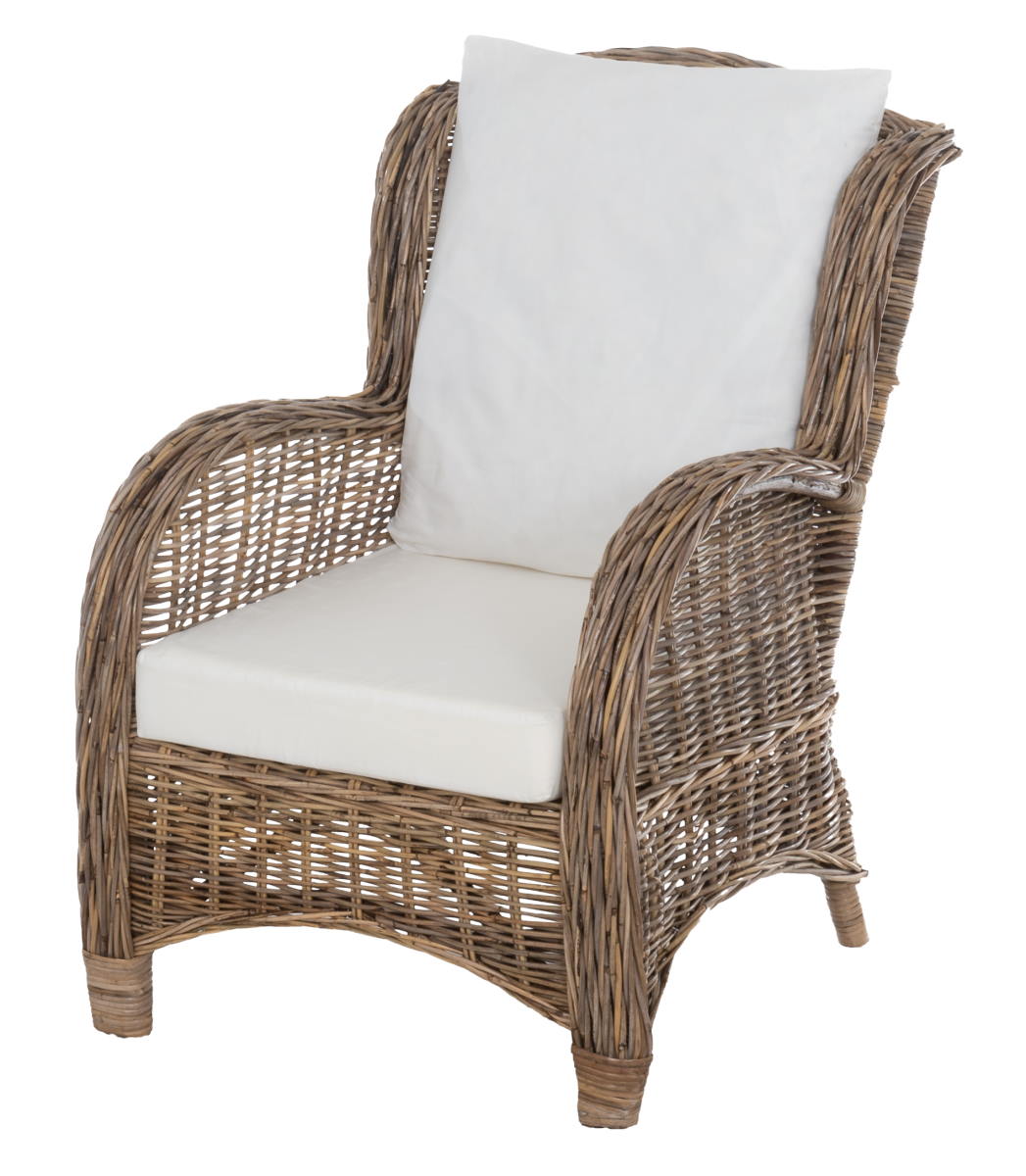 Kaunis rottinkinen lepotuoli puutarhaan tai terassille. Rottinkirunko, harmaa koboo punonta, KSVW istuin ja selkänoja pehmusteen kangas. Max 120 kg