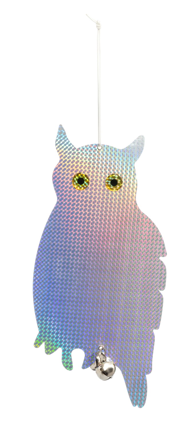 Kiiltävä, kilisevä ja heijastava pöllön muotoinen linnunpelätin pitää räkätit pois ryytimaalta ja lokit laiturinnokasta. Sisältää narun ripustusta varten, sekä 2 kpl kulkusia lisäpeloitteena. Parhaimman lopputuloksen saamikseksi ripusta vähintään kaksi pöllöä peloitteeksi.