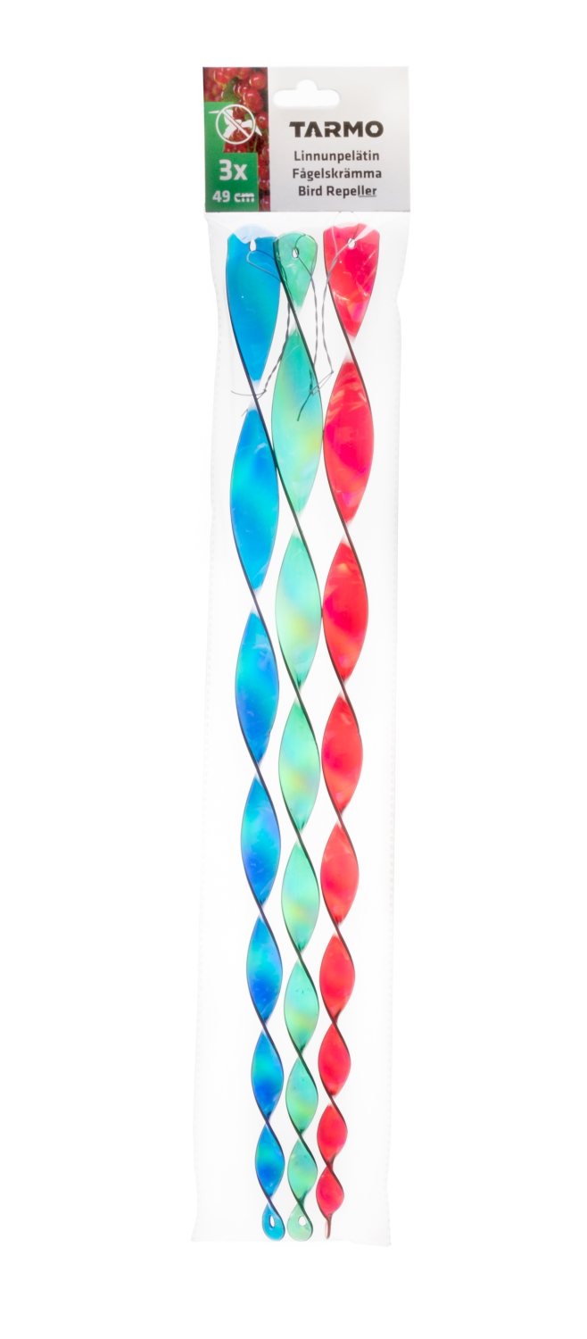Pakkaus sisältää 3kpl erivärisiä spiraalipelottimia, jotka ripustetaan esimerkiksi puun oksaan roikkumaan ja tuulen osuessa siihen se alkaa pyöriä ja välkehtiä.