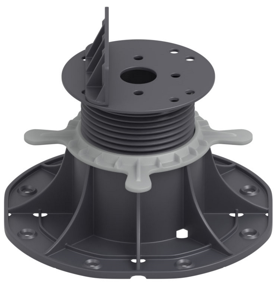 Helposti säädettävällä tukijalla saa helposti terassin tukipuut tuettua suoraan. Tukipuu voidaan kiinnittää sivusta tuen päällä olevaan adapteriin.Vääntörenkaalla asetetaan korkeus. Kantavuus max. 1000kg, rakennesuositus kantavuus 400kg. Halkaisija 100/180mm. - Portaaton korkeudensäätö - Useita kiinnityspisteitä - Jalustan kiinnitysreiät 6,5mm - Materiaali PP.