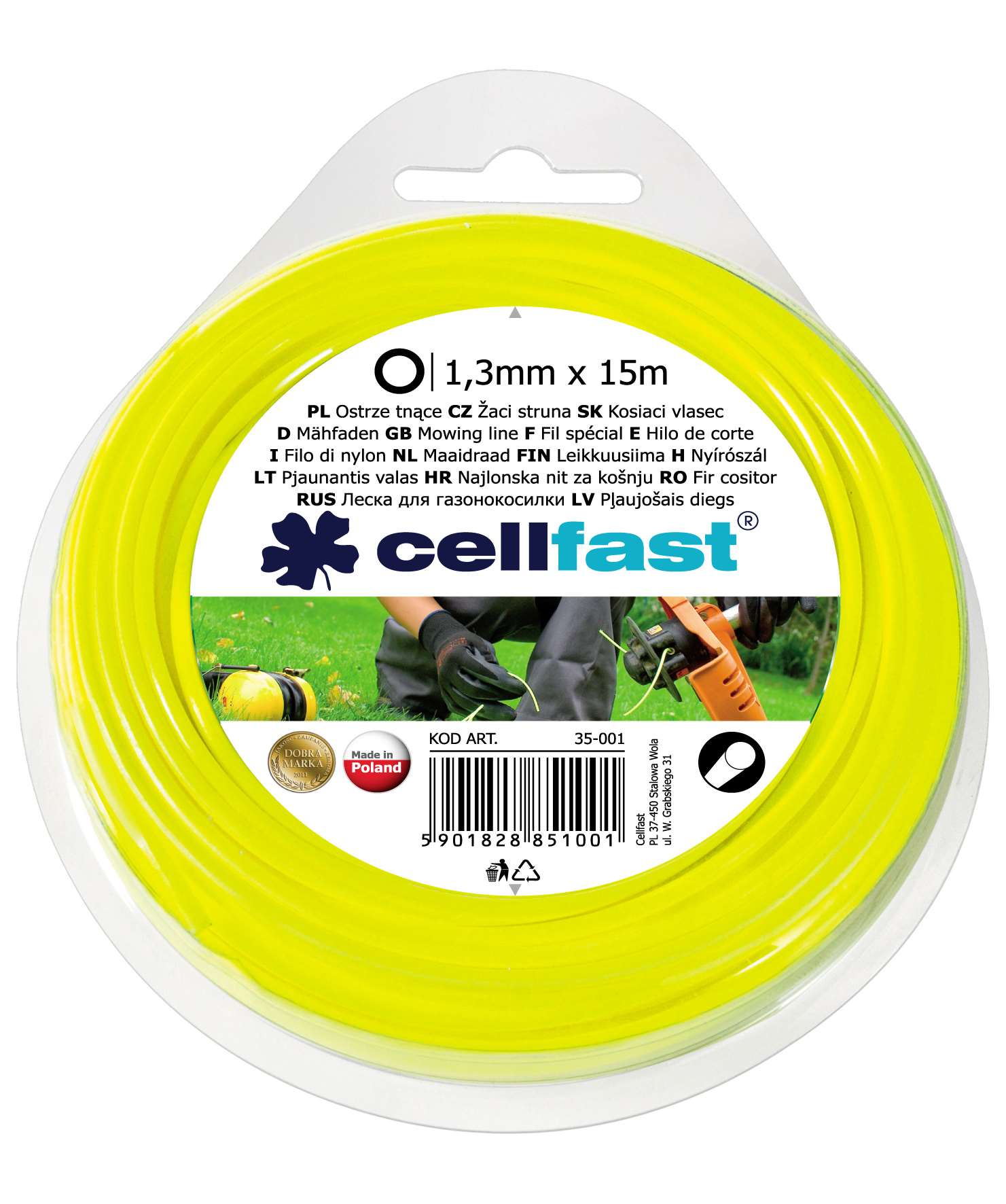 Varmasti kestävä Cellfast-trimmerin siima, jonka pyöreän profiilin ansiosta heinikoiden trimmaaminen käy joutuisasti ja siististi.