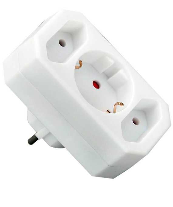Sisäkäyttöön tarkoitettu haaroitin, jossa paikat kahdelle europistotulpalle ja yhdelle maadoitetulle pistotulpalle.