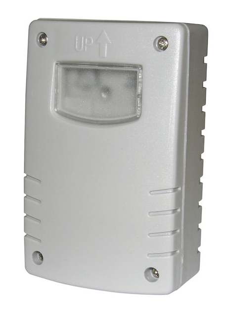 Tyylikäs harmaan värinen hämäräkytkin IP44 luokituksella.