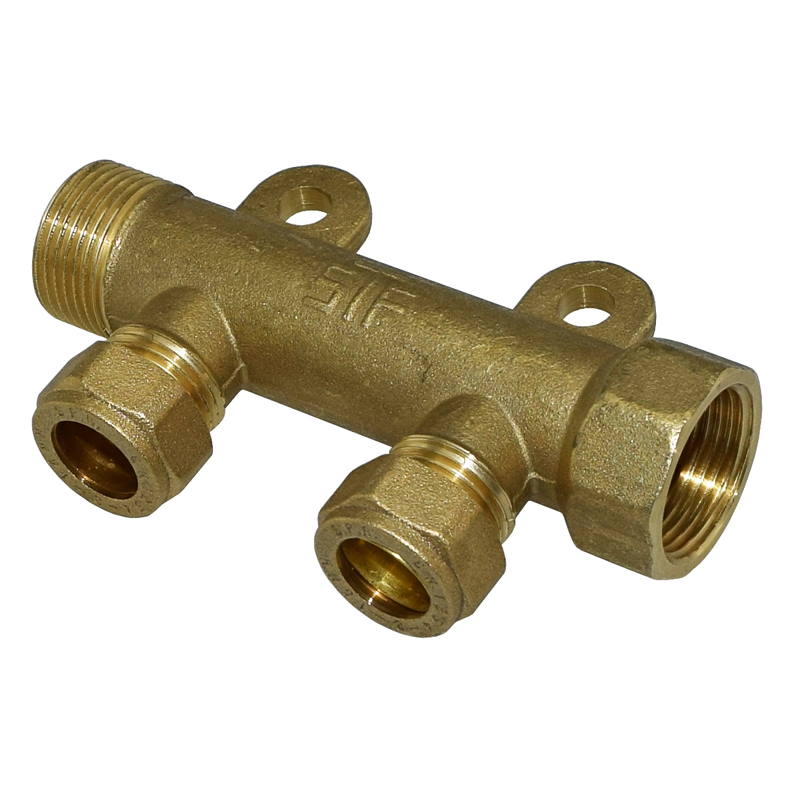Messinkinen jakotukki II-liittimin. Myös jakotukkien sisäpuolet koneistettu. 1/2" sisäkierteet, väli 50 mm. 3/4" karhennetut ulkokierteet. STF-tyyppihyväksytty, valmistettu kuumapuristamalla.