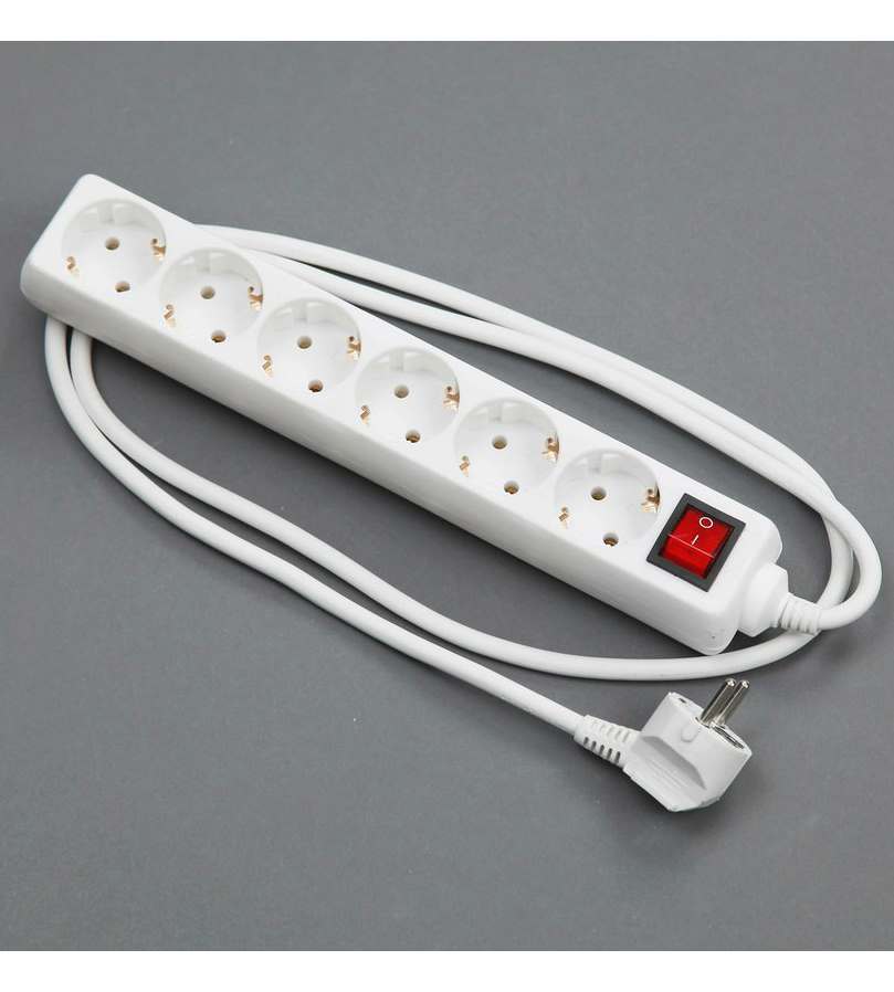 6-osainen valokytkimellinen maadoitettu valkoinen jatkojohto. Kaapelin tyyppi H05VV-F 3G1,5mm². Pistorasioissa lapsisuojat. Sisäkäyttöön.