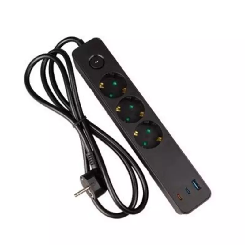 Jatkojohdossa on kaksi USB-C-porttia ja yksi USB-A-portti. USB-C Power Delivery -tuki mahdollistaa jopa 65 W pikalatauksen, joten se soveltuu myös kannettavien tietokoneiden lataamiseen.