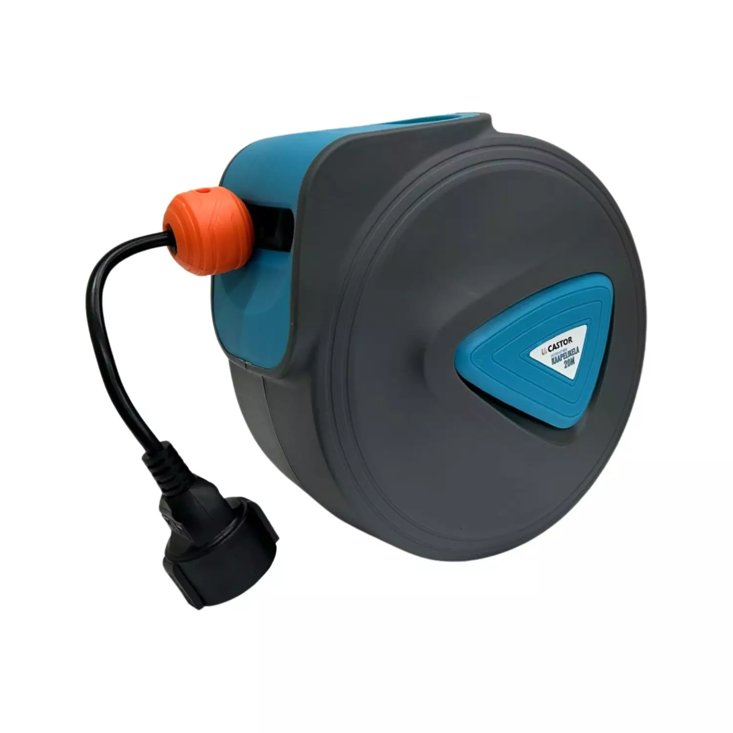 Pituus 20m + 1,5mm. Kaapeli H05VV-F 3x1,5mm². Automaatisella kelauksella. Schuko pistoke. Ulosveto pysäytystoiminnolla,