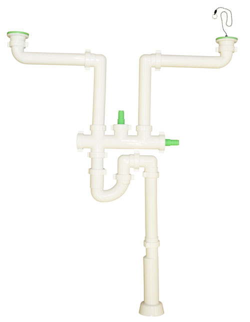 Kaksoisvesilukko on allaskaappitilaa säästävähelposti asennettava malli. Kuulaketju renkain, roskasihti ja seinäpidin sisältyvät toimitukseen. Kaksoisvesilukko oidaan asentaa eritasoaltaille ja myös seinäviemäriin.