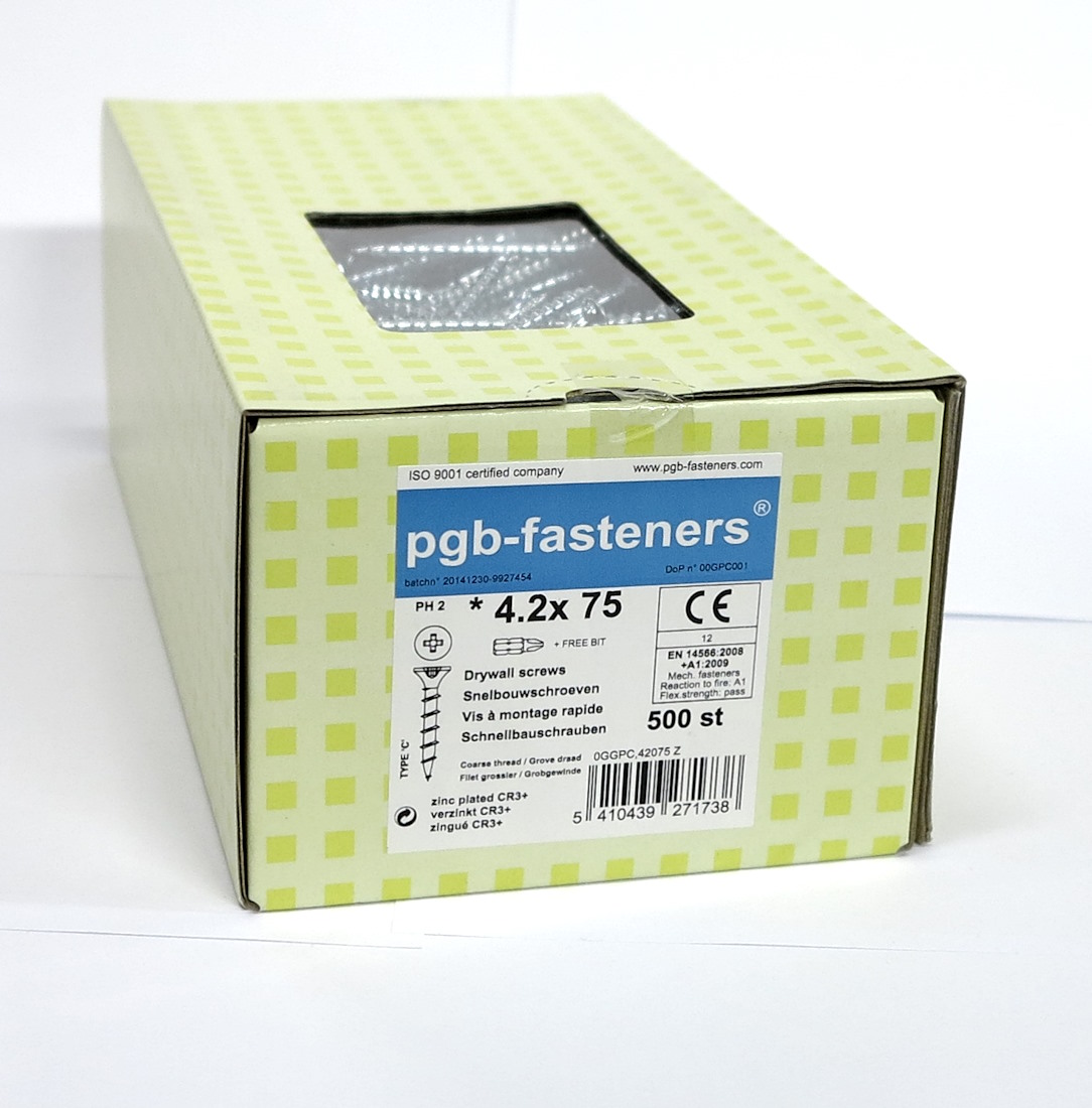 Laadukas pgb-fastenersin kipsilevyruuvi. Paketissa 500kpl, sisältää ruuvauskärjen PH2. Harvakierteinen.