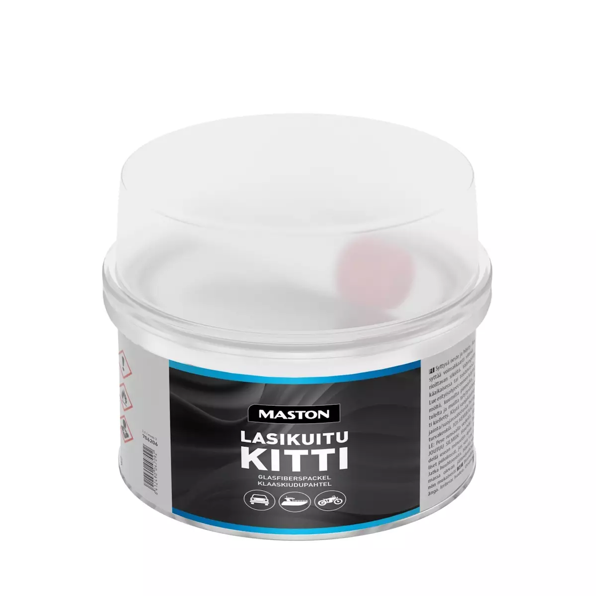 Maston Lasikuitukitti on lasikuituvahvisteinen muovikitti. Käytä lasikuiturakenteiden reikien ja murtumien korjaukseen. Soveltuu lasikuiduille (GFK/GRP), polyesterikittien, akryyli- ja epoksipohjamaalien päälle, jos pinnat ovat hyvässä kunnossa. Hyvin hiottujen 2K pohjamaalien päälle. Sopii myös peltien korjaamiseen, sekä voidaan käyttää paljaalle tai sinkkipinnoitetulle teräkselle ja alumiinille tasoituksen ja rasvanpoiston jälkeen.