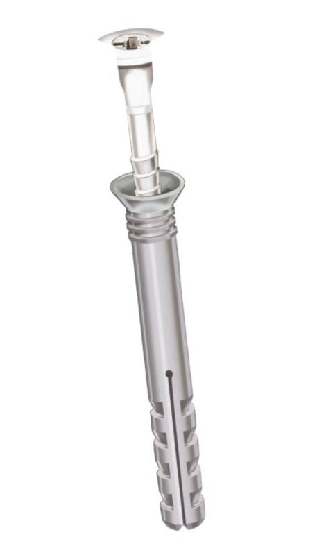Esiasennettu sähkösinkitty naula ja polyamidi (nylon) -tulppa.