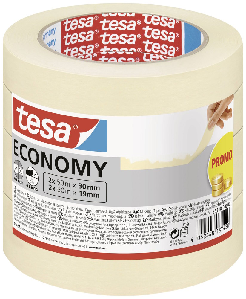 tesa® Maalarinteippi Economy on yleiskäyttöinen tesa®-teippi. Erittäin monikäyttöinen maalarinteippi soveltuu kaikenlaisiin maalaustekniikoihin ja useimmille maaleille. Se takaa tarkat maalirajat ja ammattitason tulokset. Teippi tarttuu hyvin lähes kaikkiin tasaisiin pintoihin, ja takuun mukaisesti sen voi poistaa jälkiä jättämättä 4 päivän kuluessa kiinnittämisestä sisäkäytössä.