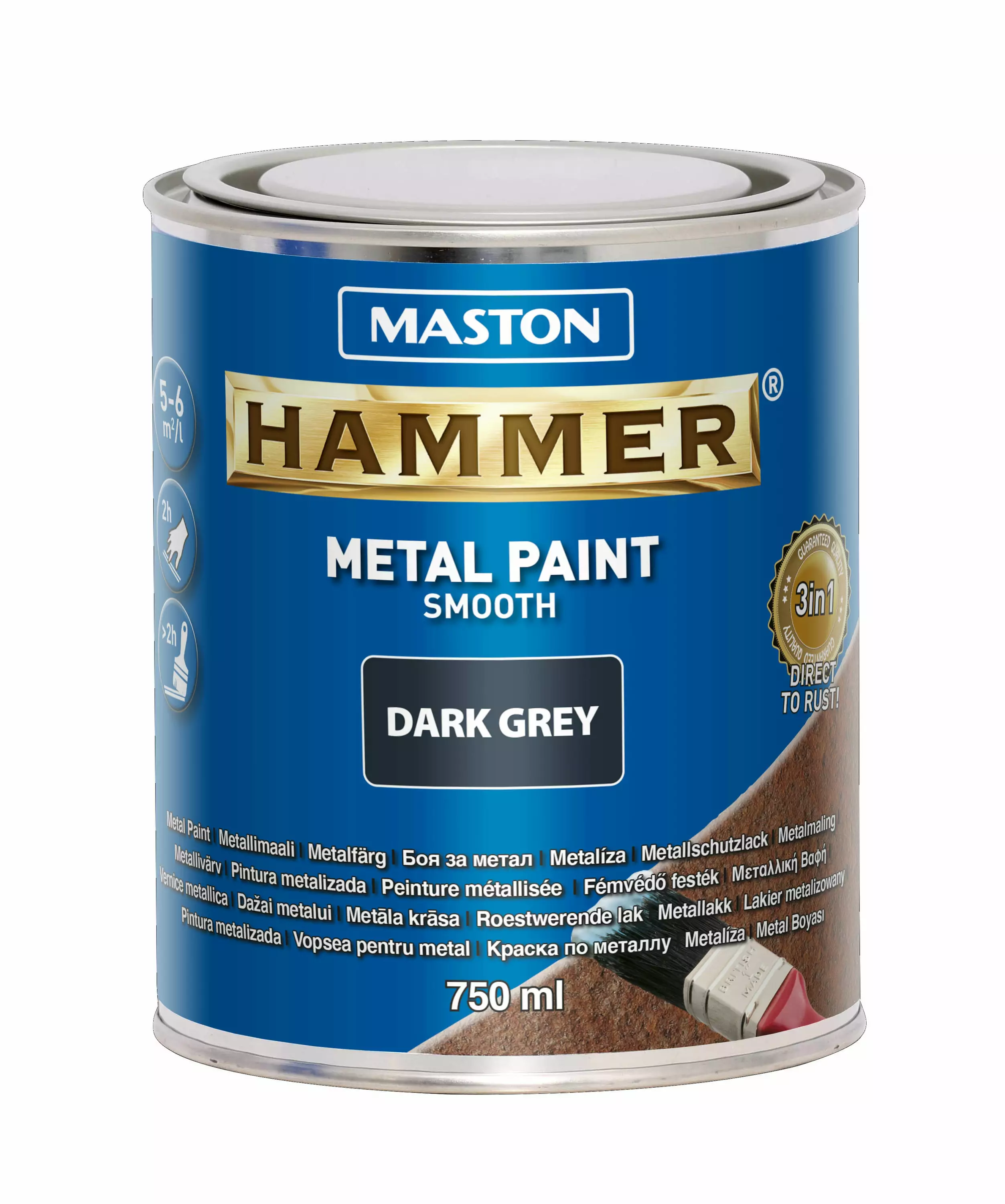 Maston HAMMER SMOOTH (sileä) METALLIMAALI jossa ruosteenesto-, pohjamaali- ja pintamaali yhdessä muodostaa lujan, kiiltävän pinnan kaikille metallipinnoille. Soveltuu sisä- ja ulkokäyttöön. Voidaan levittää suoraan käsiteltäville pinnoille, myös ruosteisille pinnoille. Ilmaa ja kosteutta läpäisemätön maalikerros pysäyttää korroosion ja suojaa metallipintaa tehokkaasti. Soveltuu myös puupintojen käsittelyyn. Käyttöohje ESITYÖT: Poista irtonainen ruoste ja lohkeileva maali teräsharjalla maalattavalta pinnalta. Puhdista pinta rasvasta ja liasta. Kuivata kosteat pinnat ennen maalausta. Sekoita maali huolellisesti ennen käyttöä. Sekoita maalia myös levityskertojen välillä. MAALAUS: SIVELTIMELLÄ: Käytä leveähköä sivellintä. Levitä maalia paksu tasainen kerros ristikkäisin siveltimenvedoin. Viimeistele pinta kevyesti sivelemällä. Tarvittaessa voit uusia käsittelyn 2-8 tunnin aikana tai 8 vuorokauden jälkeen (+20°C) vain itsellään eli Maston Hammer maalilla. TELALLA: Käytä luonnonkuitutelaa. Peitä pinta tasaisesti. Tarvittaessa voit ohentaa maalia Maston Hammer ohenteella tai Maston ksyleenillä. Ruiskumaalauksessa ohennus 5-20%. RIITTOISUUS: Käyttökohteesta ja levitystavasta riippuen 5-6 m2/l. OHENNUS JA TYÖVÄLINEIDEN PUHDISTUS: Ohennus ja työvälineiden puhdistus Maston Hammer ohenteella (Thinner) tai Maston Ksyleenilla. KUIVUMISAIKA: Kosketuskuiva: n. 2 h, Kuiva: n. 24 h. Kokonaan kuiva 7 päivän jälkeen. Päällemaalaus jos tarpeellista 2-8 tunnin aikana tai 8 vuorokauden jälkeen (+20°C) vain Maston Hammer maalilla.